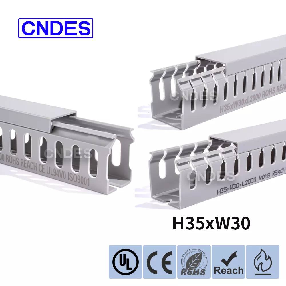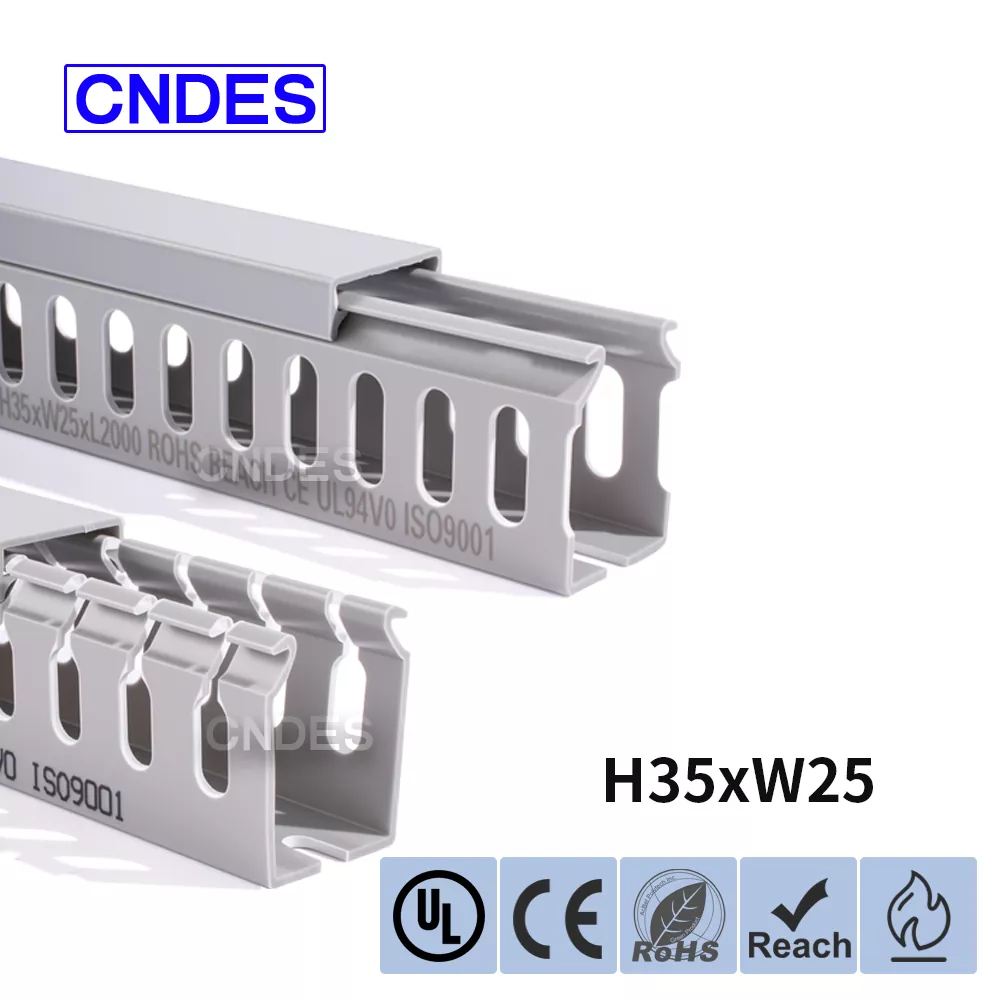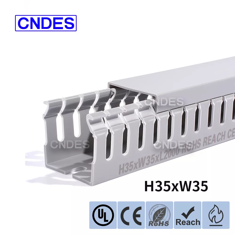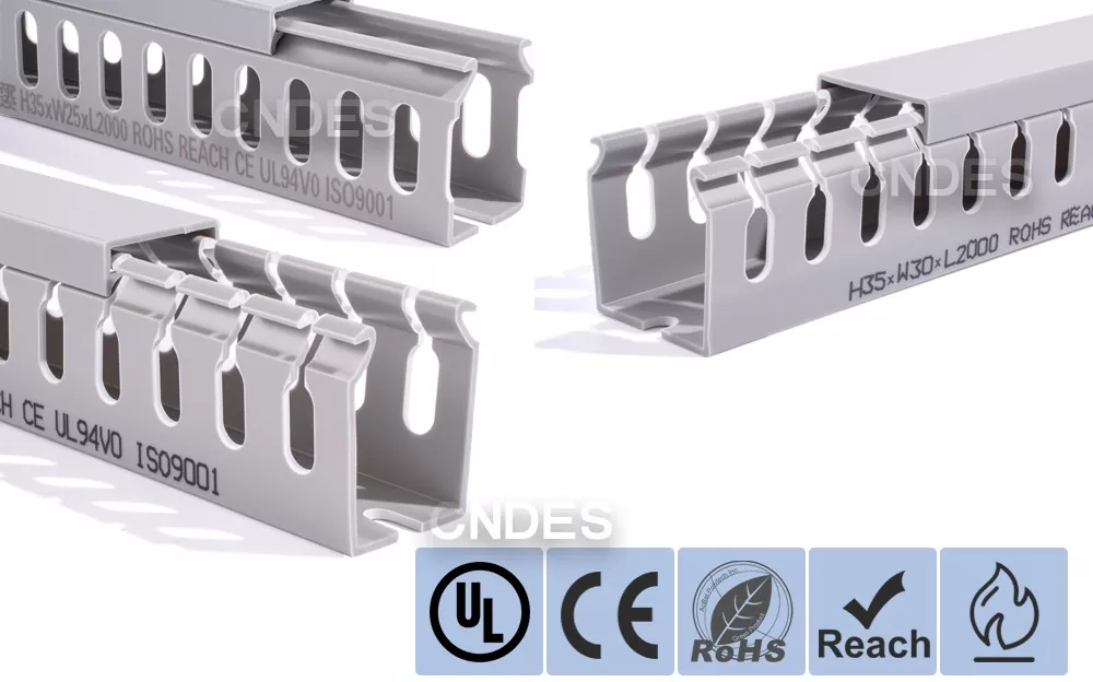 चीन की कंपनी सीएनडीईएस द्वारा निर्मित कस्टमाइज्ड 35 मिमी हाइट स्लॉटेड पीवीसी वायर रूटिंग डक्ट में एक कठोर पीवीसी बेस और एक हटाने योग्य कवर होता है। आधार में दोनों तरफ समान दूरी पर उंगली जैसी खांचे अंकित हैं, जो "कंघी के दांत" बनाते हैं। इन दांतों को हाथ से तोड़ा जा सकता है, जिससे तार किसी भी स्थिति से क्षैतिज रूप से बाहर निकल सकता है। कवर आसानी से वापस अपनी जगह पर आ जाता है और साफ-सुथरा रूप बरकरार रखता है। तल पर बढ़ते छेद की एक पंक्ति DIN 43659 मानक रिक्ति के अनुरूप है। इसे M5 स्क्रू या रिवेट्स का उपयोग करके पैनलों, कैबिनेट फ़्रेमों या समान संरचनाओं में जल्दी से सुरक्षित किया जा सकता है।