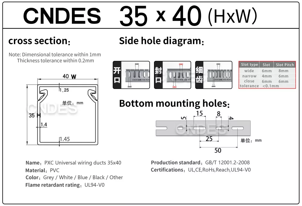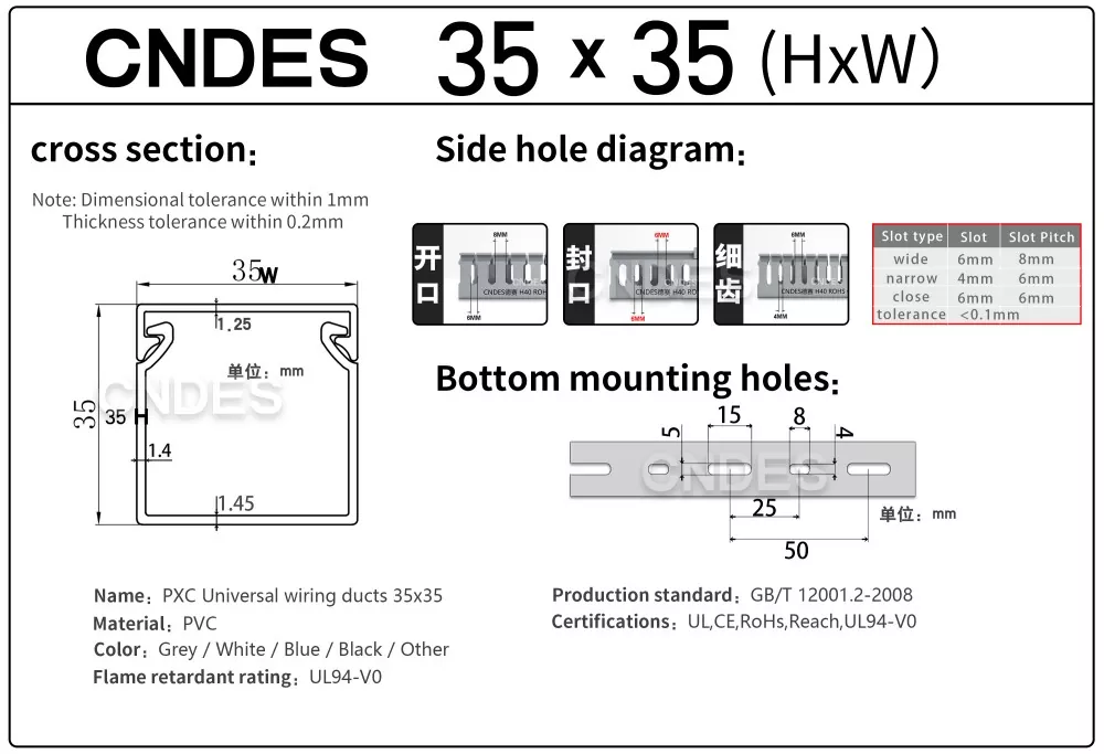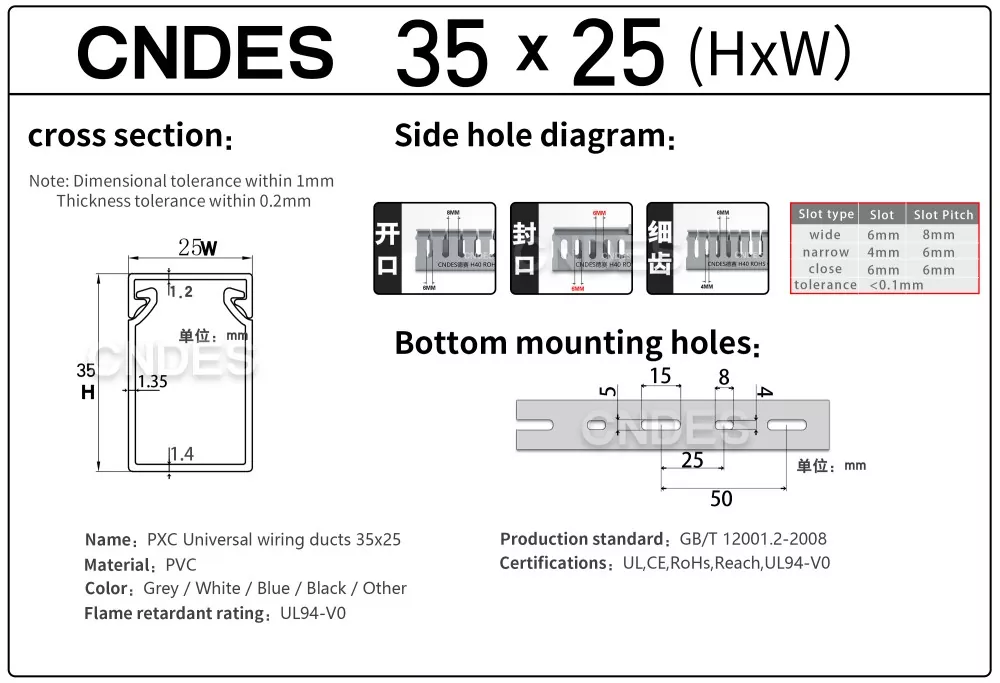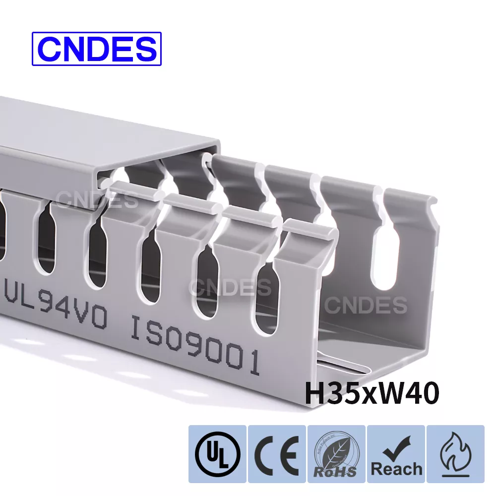 चीन की कंपनी सीएनडीईएस द्वारा निर्मित कस्टमाइज्ड 35 मिमी हाइट स्लॉटेड पीवीसी वायर रूटिंग डक्ट में एक कठोर पीवीसी बेस और एक हटाने योग्य कवर होता है। आधार में दोनों तरफ समान दूरी पर उंगली जैसी खांचे अंकित हैं, जो "कंघी के दांत" बनाते हैं। इन दांतों को हाथ से तोड़ा जा सकता है, जिससे तार किसी भी स्थिति से क्षैतिज रूप से बाहर निकल सकता है। कवर आसानी से वापस अपनी जगह पर आ जाता है और साफ-सुथरा रूप बरकरार रखता है। तल पर बढ़ते छेद की एक पंक्ति DIN 43659 मानक रिक्ति के अनुरूप है। इसे M5 स्क्रू या रिवेट्स का उपयोग करके पैनलों, कैबिनेट फ़्रेमों या समान संरचनाओं में जल्दी से सुरक्षित किया जा सकता है।