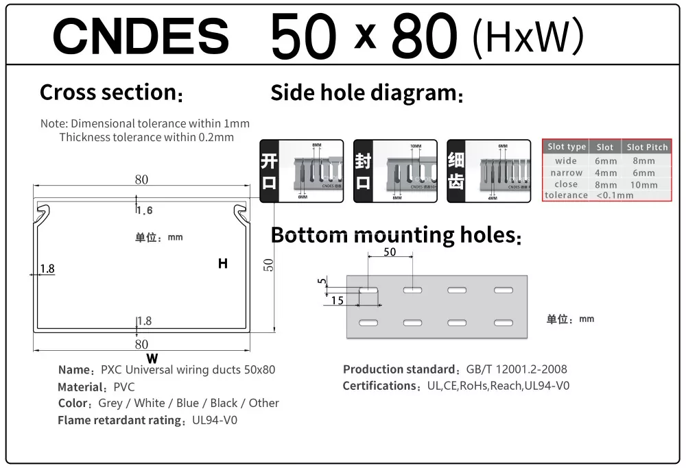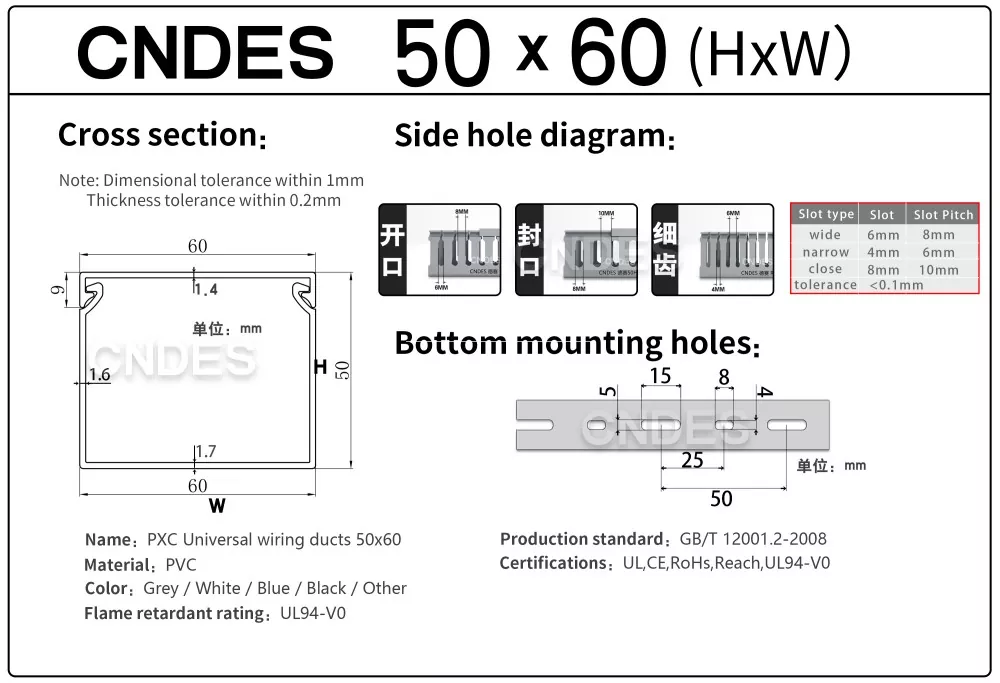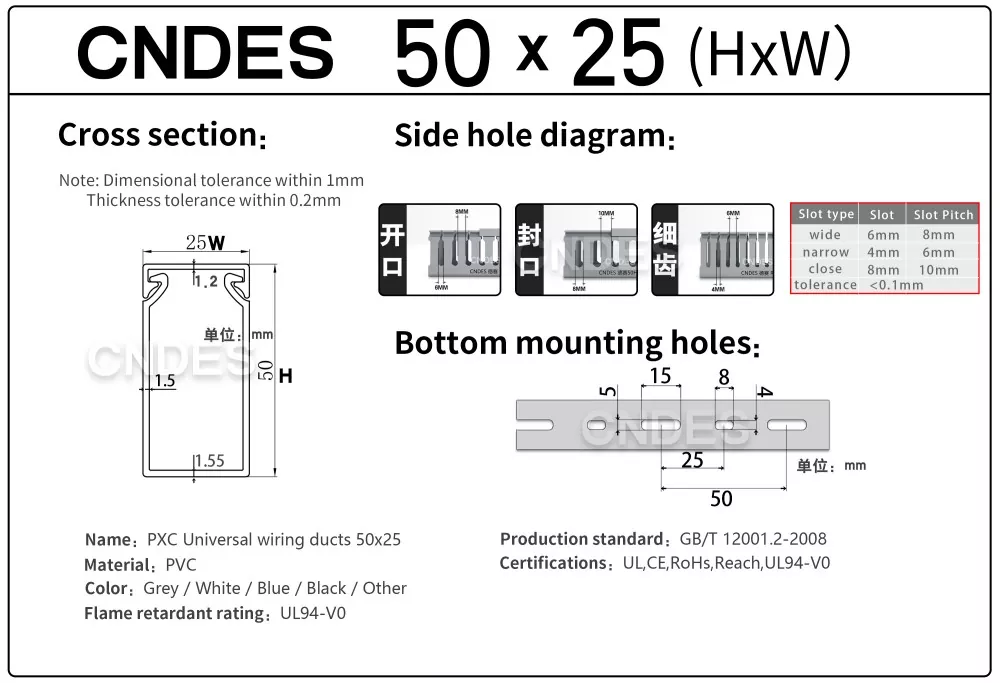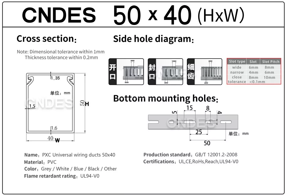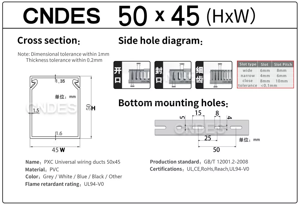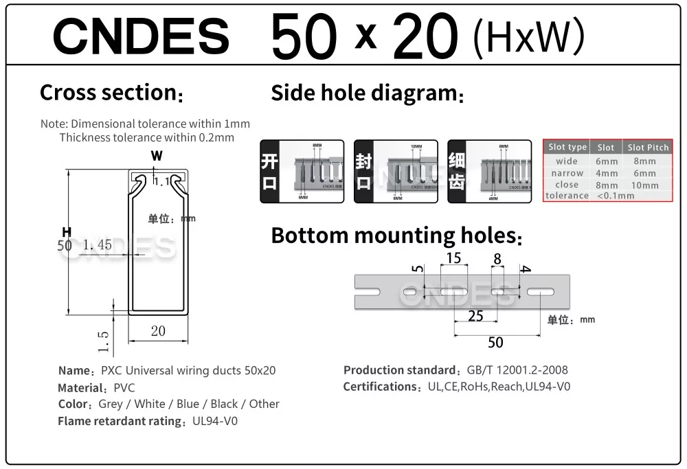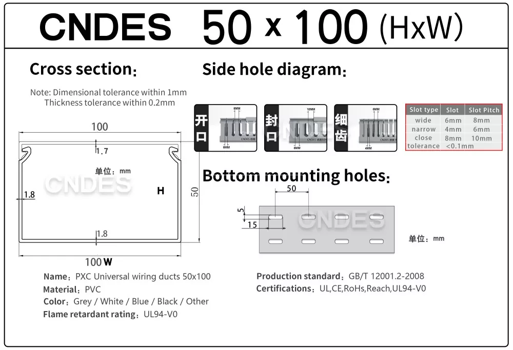 सीएनडीईएस एक निर्माता और आपूर्तिकर्ता है जो स्लॉटेड पीवीसी पैनल वायरिंग डक्ट की आपूर्ति में विशेषज्ञता रखता है। यहां हम अपनी 50 मिमी ऊंची वायरिंग ट्रंकिंग पेश करेंगे, जिसमें निम्नलिखित विशिष्टताएं शामिल हैं: 50*20,50*25,50*30,50*35,50*40,50*45,50*50,50*55,50*60,50*80,50*100।