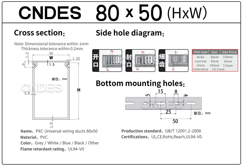 सीएनडीईएस चीन में स्थित पीवीसी स्लॉटेड केबल ट्रे का एक पेशेवर निर्माता है। यहां, हम अपना 80×50 स्लॉटेड पीवीसी पैनल केबल ऑर्गनाइज़र पेश करेंगे, जहां 80*50 मिमी 80 मिमी की ऊंचाई और 50 मिमी की चौड़ाई के साथ एक केबल ट्रे का प्रतिनिधित्व करता है।