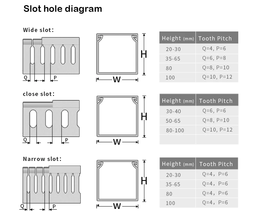 हमारी कंपनी द्वारा उत्पादित कस्टमाइज्ड व्हाइट स्लॉटेड पीवीसी वायरिंग डक्ट्स डिफ़ॉल्ट रूप से सिल्वर व्हाइट होते हैं, लेकिन इसे शुद्ध सफेद या ऑफ-व्हाइट होने के लिए भी अनुकूलित किया जा सकता है। हम आपके चयन के लिए विस्तृत स्लॉट, संकीर्ण स्लॉट, क्लोज स्लॉट और ठोस दीवार जैसी स्लॉट प्रोफ़ाइल प्रदान करते हैं।